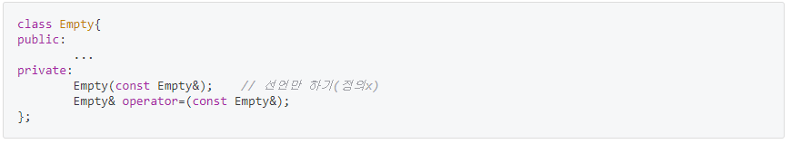 이는 friend 함수나 클래스내 멤버함수에서 복사생성자나 복사대입연산자가 호출되지 않게 하기 위한 방법이다.