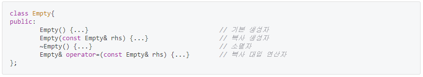 C++ 에서는 기본적으로 빈 클래스를 생성하면 자동으로 생성해주는 생성자와 소멸자 등 이있다.