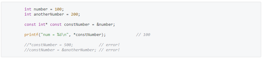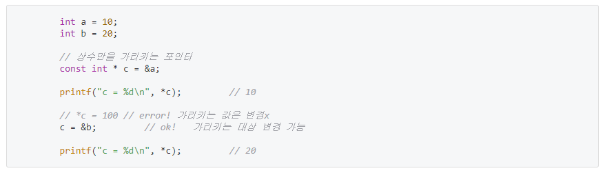 여기서 c는 const int를 가리키므로 가리키는 '값'을 변경하는 건 불가능하다. ( 가리키는 값이 불변 )