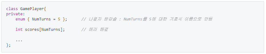 - 이 책의 경우는 위에 말한 경우를 제외하고, 클래스를 컴파일하는 도중에 클래스 상수의 값이 필요할 때인데, 배열 멤버를 선언할 때의 경우, 배열의 크기를 알아야 한다며 정적 타입의 정적 클래스 상수에 대한 클래스 내 초기화를 금지하는 에러를 배출하는 경우 나열자 둔갑술을 사용하여 해결 할 수있다.