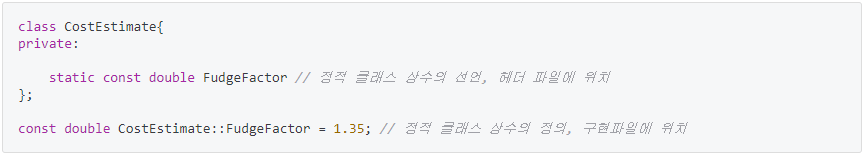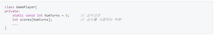 - 클래스 멤버로 상수를 정의하는 경우, 그 상수의 사본 개수가 한 개를 넘지 못하게 하기 위해선 정적(static) 멤버로 만들어야한다.